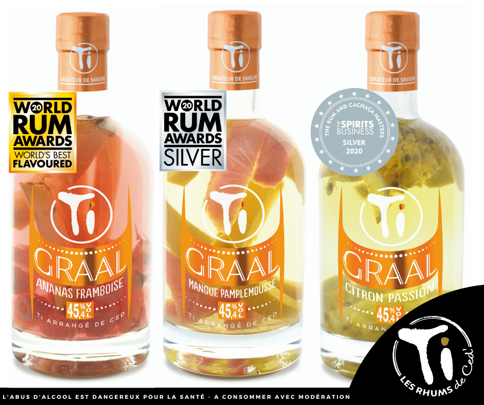 Depuis son lancement en 2019, la gamme des GRAAL Ti Ced’ truste les podiums de concours internationaux de spiritueux ! Cette année 2020 ne déroge pas à la règle avec trois très belles distinctions qui viennent déjà auréoler chacune des recettes de GRAAL ! La nouveauté 2020 des Rhums de Ced’ « Mangue Pamplemousse » remporte une médaille d’Argent aux World Rum Awards de Londres tandis que le punch au rhum Ananas Framboise décroche avec brio son GRAAL avec le titre de « BEST FLAVOURED RUM » (Meilleur Rhum Arrangé au monde) ! Des médailles qui viennent récompenser l’intuition et le savoir-faire d’équilibriste de Ced’ ! « Toutes ces récompenses sont avant tout l’accomplissement d’un travail minutieux que je ne pourrai pas proposer sans l’engagement de mes 9 collaborateurs à l’atelier ! » Précise Ced’.